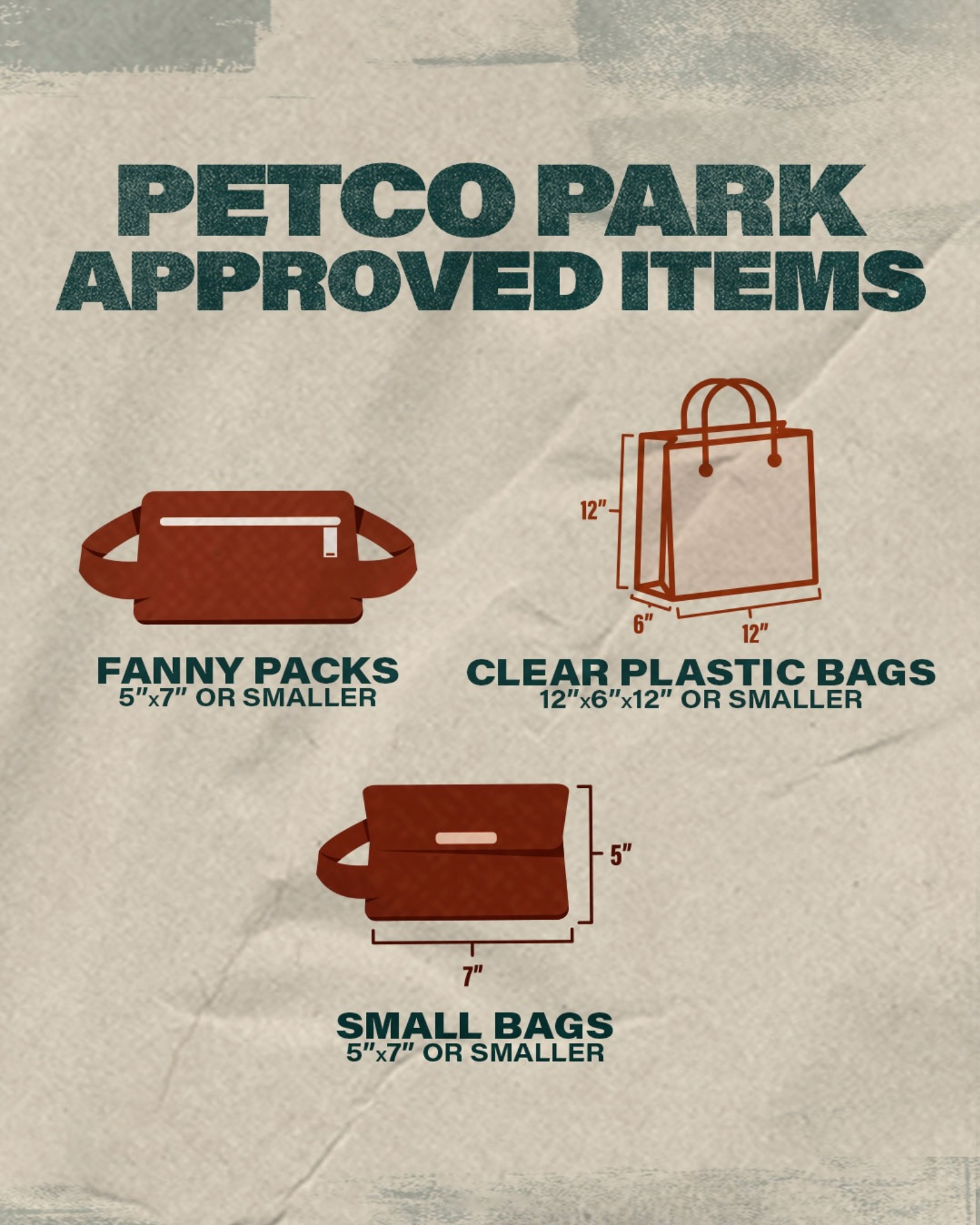 For enhanced ballpark security and to expedite the entry process for all our guests, Petco Park prohibits bags with the exception for single compartment clear plastic bags not exceeding 12” X 6” X 12” and infant and medical bags. Clutches and purses no larger than 5” X 7”.